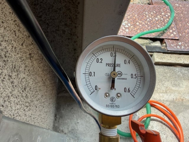 修繕後は混合ガスにて圧力検査。20分放置で全く動き無しで合格です。やっぱ水素式漏水探索は値打ちありますね~最小破壊の短時間で解決できますから・・・ナイス相棒です