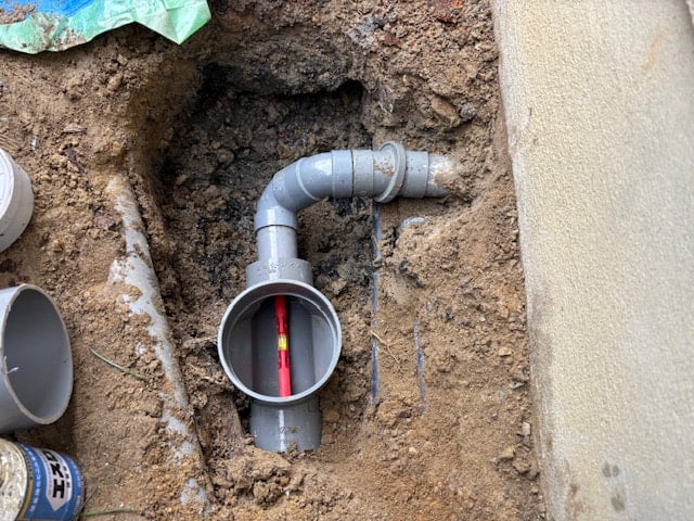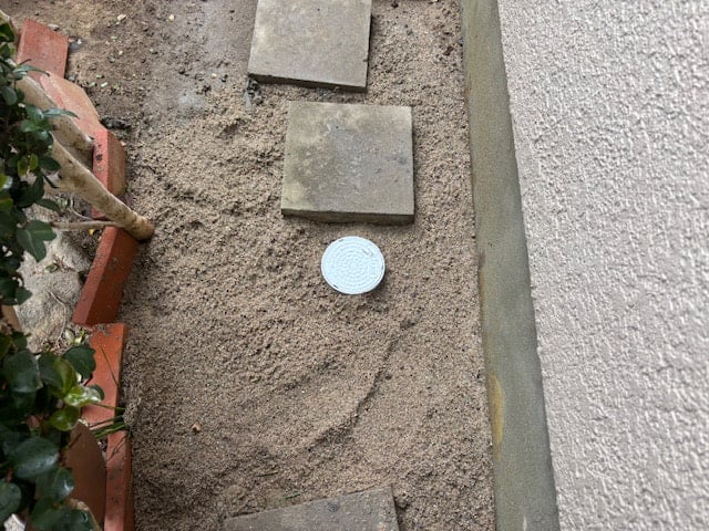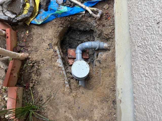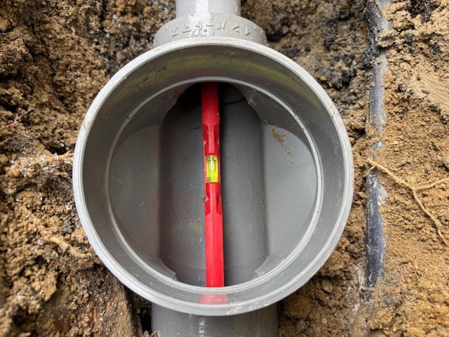 地盤が緩いので赤レンガで桝下へ沈み防止処置をして