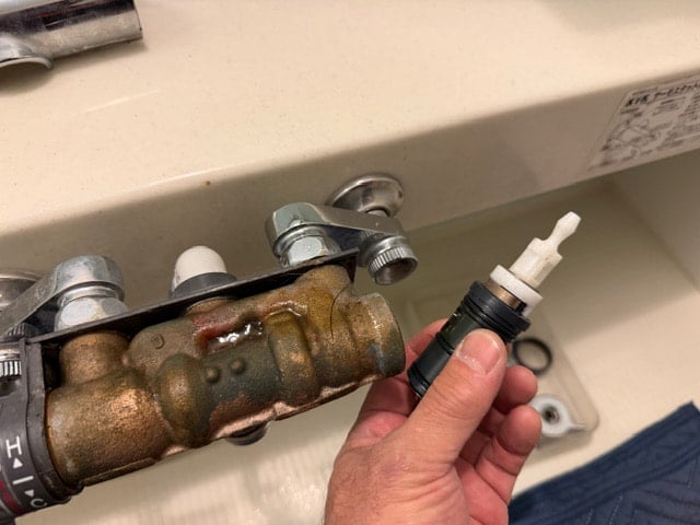 KVK/KF800シリーズの突然水が出なくなるトラブルの際に水栓右側の切替弁部交換で対応させていただいていますが、パーツの固着により抜けなくなってかなり苦労する場合があります。YOUTUBEなどでもこでたり無理くり叩いて外したりする動画が出てるのですが、もっといい方法ないんか?と考えて思いついた方法で