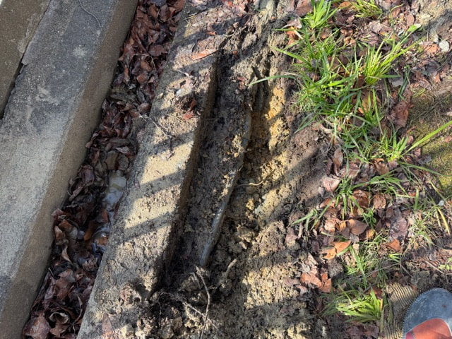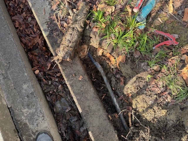 とにかく掘削して状況確認。即対応案件なので市の緊急作業許可を得て作業に入るのですが、こういった案件はミスなく作業を行う腕と判断力が命。掘削しながら給水管に絡んだ木の根を撤去するのですが、手元が狂わないように使う道具も今までの苦労した経験から厳選された道具でミスなく給水管を傷つけず木の根を切っていきます。電動工具ですのでちょっとした手元のミスで柔らかい塩ビ製給水管に傷が入ると失敗に終わり作業が大きくなるミリ単位の撤去でかなり集中して作業していきます。