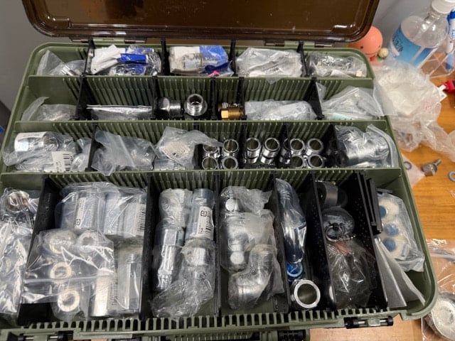 次に配管副資材系小物に着手。ここでもパケの痛んだものの交換や在庫数の調整等を行い出来るだけ車載総重量の軽量化を目指して新たな在庫数を頭に叩き込みます。