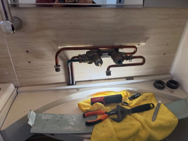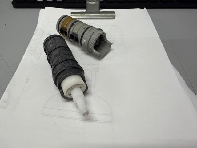 ナットが薄く強度も弱いのでモンキーレンチなどで無理やり外しにかかるとナット自体がむにゅっと変形して2度と外れなくなります。ここで熱を加える方法もあるのですがまわりのパーツにも熱が入ってしまい変形や漏水の可能性も出てくるので、ここは凍結工法でピンポイントでナットを収縮させモンキーではなくパイプレンチをナットの一番強度のある部分に掛けて外したのですが、肝心の切替弁ASSYは全く抜ける気配も見せません。ここからは手探りでこのパネル構造を理解し分解です。