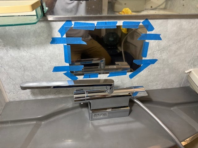 カウンター裏の補強部分を書き出して補強部と干渉しないよう水栓の取り付け位置を決定します。